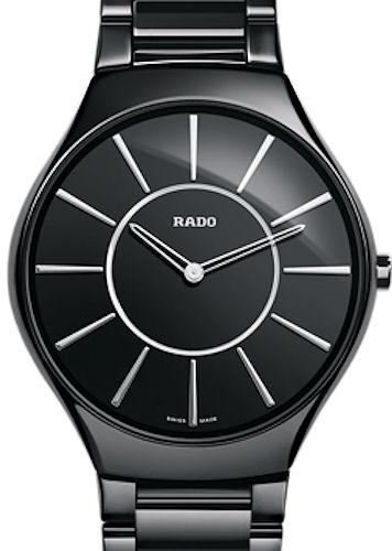 Rado True Thinline collection. High-tech scratch proof black ceramic case and bracelet. Sapphire crystal. Black dial with silver tone hands and markers. Watch is powered by quartz movement