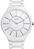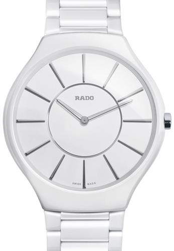 Rado True Thinline collection. High-tech scratch proof white ceramic case and bracelet. Sapphire crystal. White dial with silver tone hands and markers. Watch is powered by quartz movement