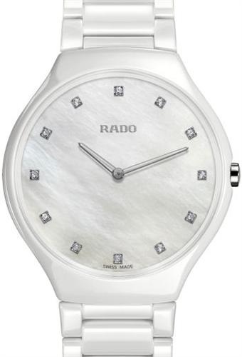 Rado True Thinline collection. High-tech scratch proof white ceramic case and bracelet. Sapphire crystal. White Mother-of-Pearl dial with diamond markers. Watch is powered by quartz movement