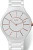 Rado True Thinline collection. High-tech scratch proof white ceramic 30mm case and bracelet. Sapphire crystal. White dial with rose gold tone hands and markers. Watch is powered by quartz movement