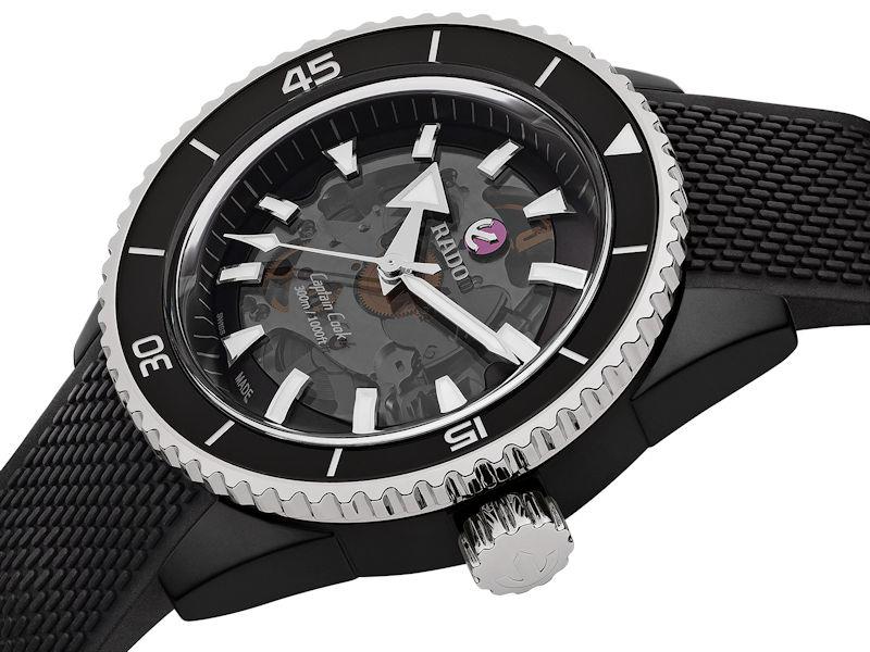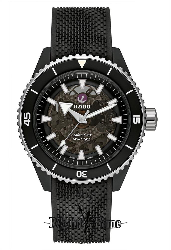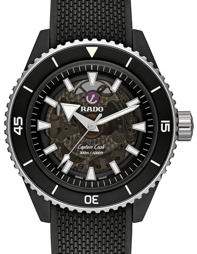 Rado Hyperchrome Captain Cook, model R32127156. Black high-tech ceramic case. Black outer ring with skeleton dial. Steel tone luminous hands and markers. Rado Caliber R734 automatic movement with 80 hours power reserve. Uni-directional bezel with black ceramic insert. Domed sapphire crystal with anti-reflective coating. Black rubber strap with deployant clasp. Water resistant to 300 meters.