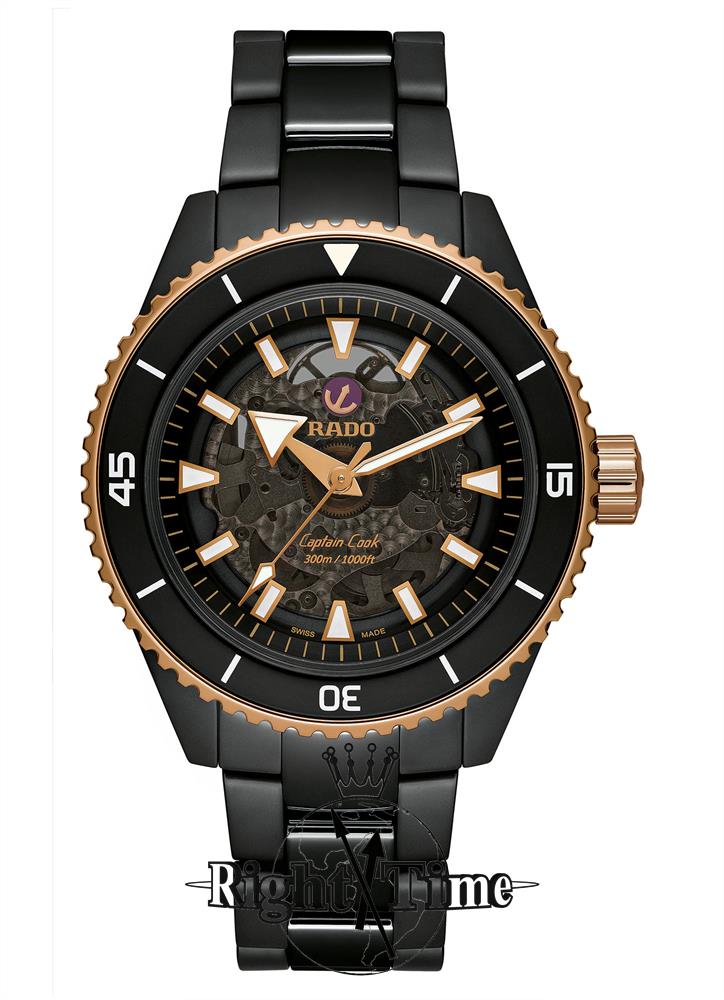 Rado Hyperchrome Captain Cook, model R32127162. Swiss made Rado R734 automatic movement. Black high-tech ceramic case and bracelet. Black skeleton dial with gold tone luminous hands and markers. Gold plated uni-directional rotating bezel with black ceramic 60 minute insert. Domed sapphire crystal. Observation case-back. Water resistant to 300 meters.