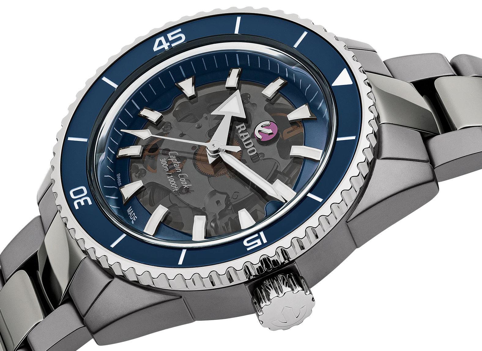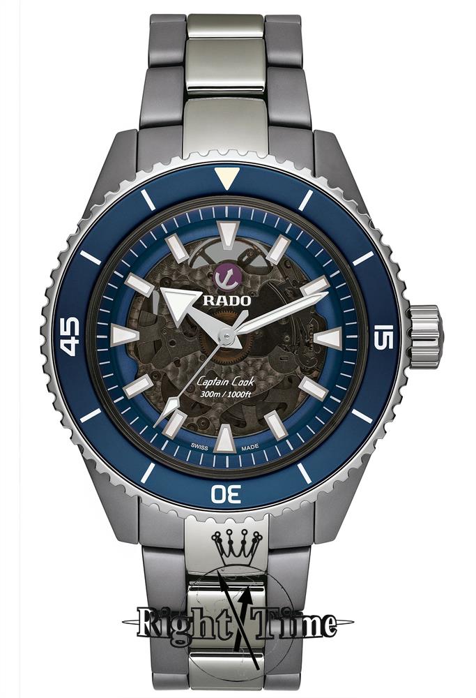 Rado Hyperchrome Captain Cook, model R32128202. High-tech ceramic case and bracelet. Blue skeleton dial with luminous hands and markers. Powered by the Rado Caliber R734 automatic movement. Uni-directional bezel with blue ceramic insert. Domed sapphire crystal. Water resistant to 300 meters.
