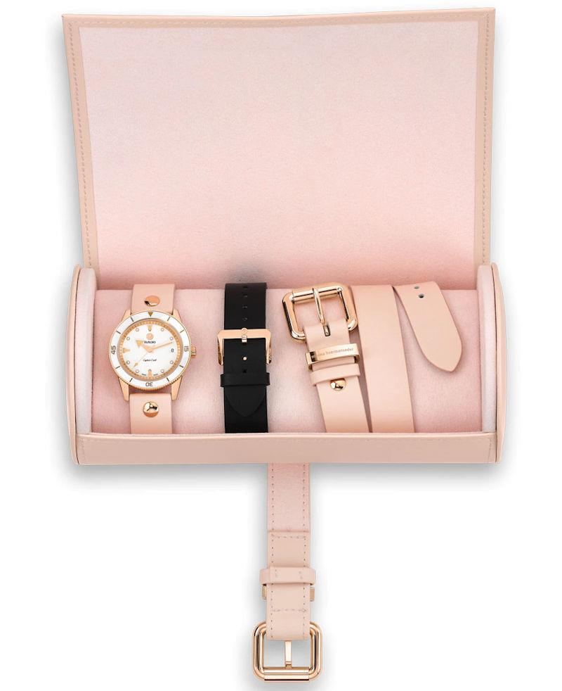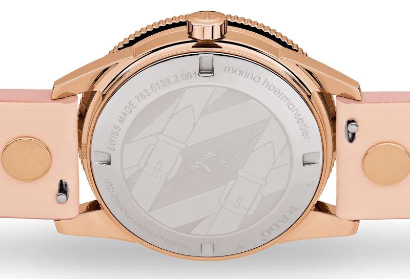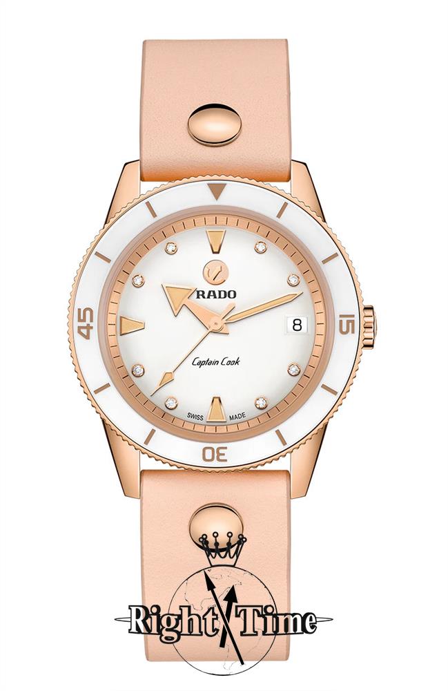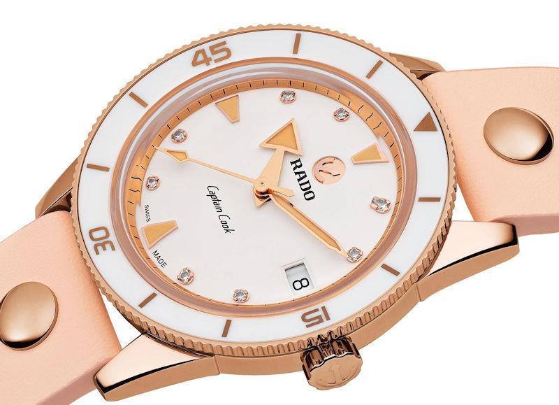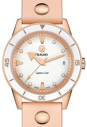 Rado Hyperchrome "Captain Cook" model R32139708. A collaboration with famed French-Austrian designer Marina Hoermanseder, this watch gives the Captain Cook series a fresh new twist. Polished rose gold PVD plated case with and bezel with a white ceramic bezel insert. Domed sapphire crystal covers a bright white dial with genuine diamond markers and rose gold hands/accents. Swiss made ETA automatic movement. Comes in a set with unique blush pink and black leather straps with rose plated rivets. Water resistant to 100meters.