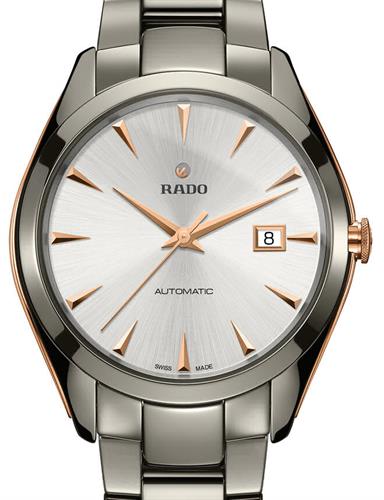 Rado Hyperchrome collection. Ceramic and stainless steel case. Sapphire crystal. Silver color dial with rose gold tone hands and indexes. Observation back. Ceramic bracelet. Watch is powered by automatic movement. Water resistant to 50 meters.