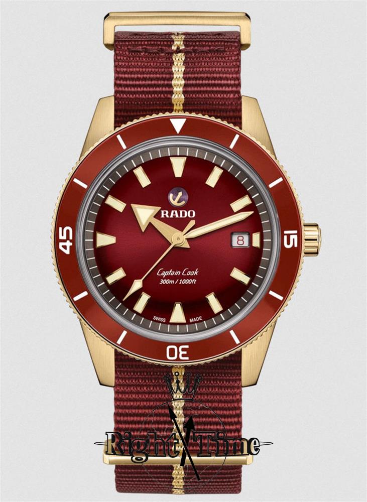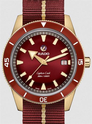 Rado Hyperchrome "Captain Cook" Special Edition. This stunning diver is an adaptation of its 1962 predecessor, named for 18th century British explorer Captain James Cook. The genuine bronze 42mm case develops its own patina over time, giving each watch its own unique look. Burgundy dial with polished bronze color accents under a domed sapphire crystal. Uni-directional bezel with burgundy ceramic 60 minute insert. Burgundy NATO strap with genuine bronze tang style buckle. Diver rated to 300 meters. Factory model R32504407.