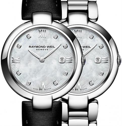 Raymond Weil Shine Collection. Model 1600-ST-00995. Stainless steel case with bracelet and interchangeable black strap. 8 diamonds on the white Mother-of-Pearl dial. Quartz movement.