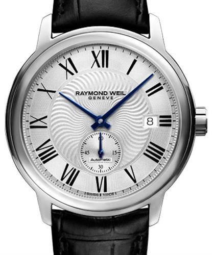 Raymond Weil 2238-STC-00659. Part of the elegant Maestro series of watches. The textured silver tone dial features classic black roman numerals, with black lacquered hands. Case is solid stainless steel with a sapphire crystal. Comes on a black leather band with a fold-over deployment clasp. Uses a RW4250 automatic movement with 31 jewels based on the Sellita SW260.