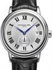 Raymond Weil Maestro model 2838-STC-00659. Swiss automatic movement. Silver tone textured dial with black Roman numerals, small seconds sub-dial, and date calendar. Blue color hands. Sapphire crystal. Stainless steel case. Black leather strap. 50 meters water resistant.