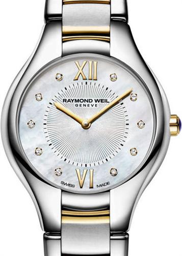 Raymond Weil Noemia model 5132-STP-00985. Quartz movement. Mother-of-Pearl dial with Roman numerals and 10 diamond markers. Sapphire crystal. 32mm stainless steel case with 2-tone bracelet. 50 meters water resistant.