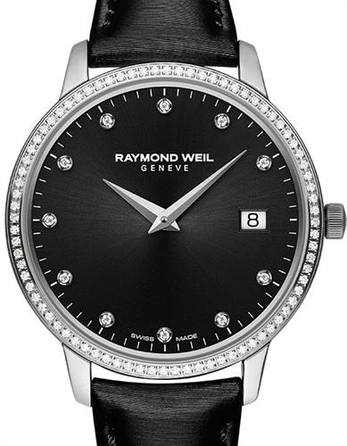 Raymond Weil Toccata model 5388-SLS-20081. Swiss quartz movement. Black dial with date calendar. Sapphire crystal. Stainless steel case. 91 (0.28 ct) diamonds on the bezel and dial. Black leather band. 50 meters water resistant.