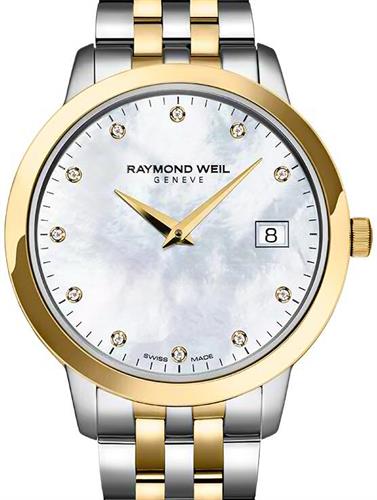 Raymond Weil Toccata model 5388-STP-97081. Swiss quartz movement. Mother-of-Pearl dial with date calendar and diamond markers. Sapphire crystal. Stainless steel case and bracelet with yellow gold plated accents. 50 meters water resistant.