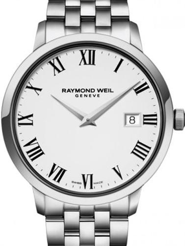 Raymond Weil Toccata model 5488-ST-00300. Swiss quartz movement. White dial with date calendar and Roman numerals. Sapphire crystal. Stainless steel 39mm case with bracelet. 50 meters water resistant.