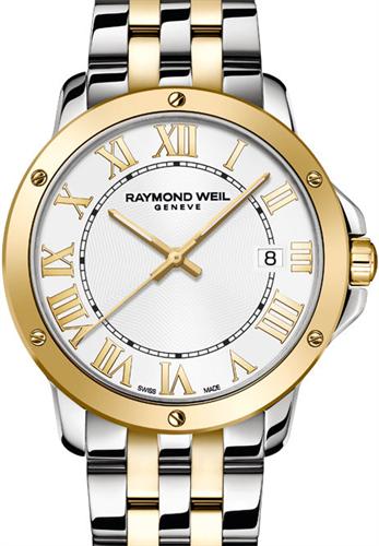 Raymond Weil Tango model 5591-STP-00308. Quartz movement with date. White textured dial with Roman markers. Sapphire crystal. 39mm stainless steel case and bracelet with gold plated accents. 100 meters water resistant.