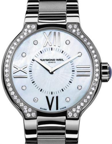 Raymond Weil Noemia model 5932-STS-00995. Quartz movement. 62 diamonds on case and dial. Mother-of-Pearl dial with Roman numerals and diamond markers. Sapphire crystal. 32mm stainless steel case with bracelet. 50 meters water resistant.