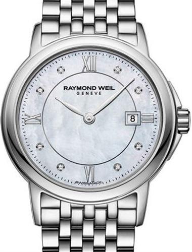 Raymond Weil Tradition model 5966-ST-00995. Swiss quartz movement. White Mother-of Pearl dial with 8 diamond markers, Roman numerals and date calendar. Sapphire crystal. 28mm stainless steel case with bracelet. 50 meters water resistant.