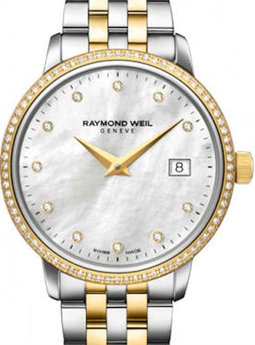 Raymond Weil Toccata model 5988-SPS-97081. Swiss quartz movement. White Mother-of-Pearl dial with date calendar and 11 diamond markers. Sapphire crystal. Stainless steel case and bracelet with gold plated accents. 71 diamonds on the case and dial. 50 meters water resistant.