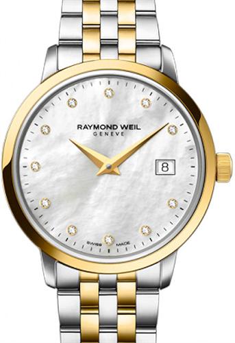 Raymond Weil Toccata model 5988-STP-97081. Swiss quartz movement. White Mother-of-Pearl dial with date calendar and 11 diamond markers. Sapphire crystal. Stainless steel case with bracelet and gold tone accents. 50 meters water resistant.