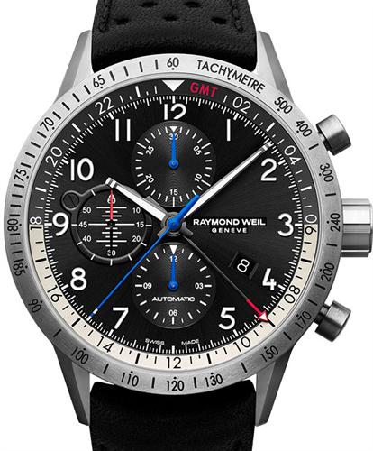 Special edition Raymond Weil Freelancer in partnership with Piper Aircraft. Model 7754-TIC-05209. Combination titanium/stainless steel case (Caseback is steel). Swiss automatic chronograph movement with added GMT function. Black dial with red & blue accents. Sapphire crystal. Water resistant to 100 meters. Comes on black leather strap with titanium deployant buckle.