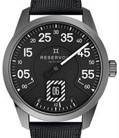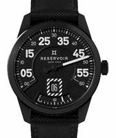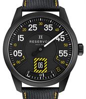 Reservoir Airfight Jet model RSV02.AF/130-15. Inspired by aviation instruments. Black dial with large white Arabic numerals and yellow color accents. Stainless steel black PVD plated case with black canvas fabric strap. Watch features: retrograde minute hand; jumping hours; power reserve indicator.