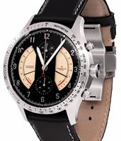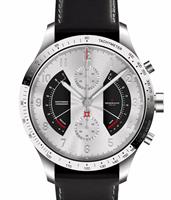 The watch is powered by bi-retrograde chronograph automatic movement caliber RSV-Bi120. Comes in steel case with silver and black dial, and leather strap.