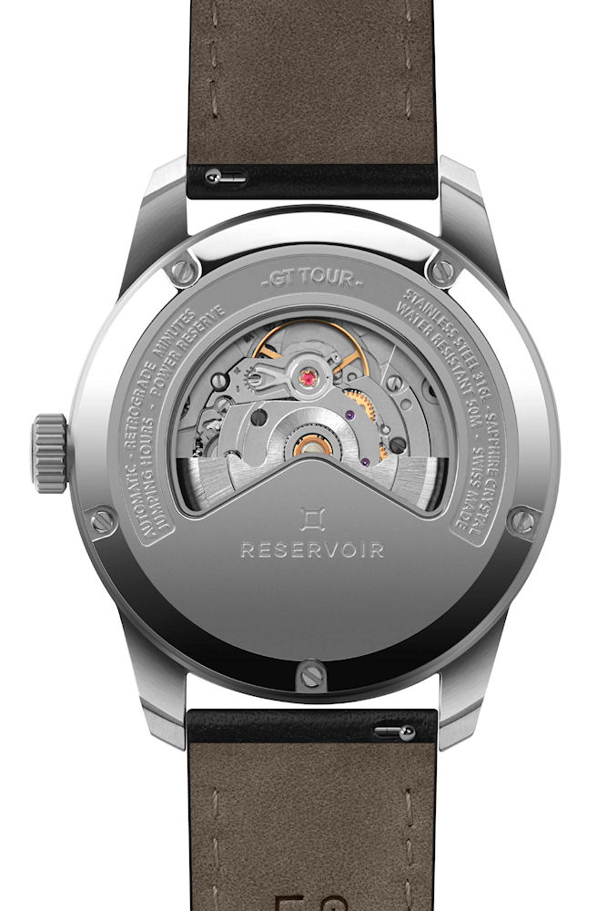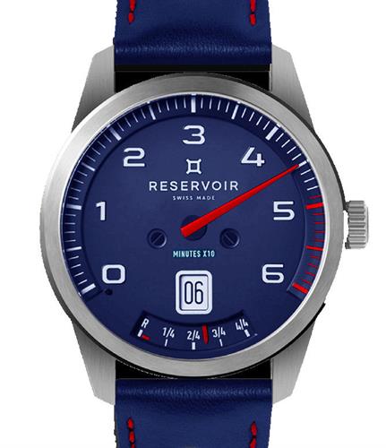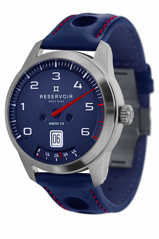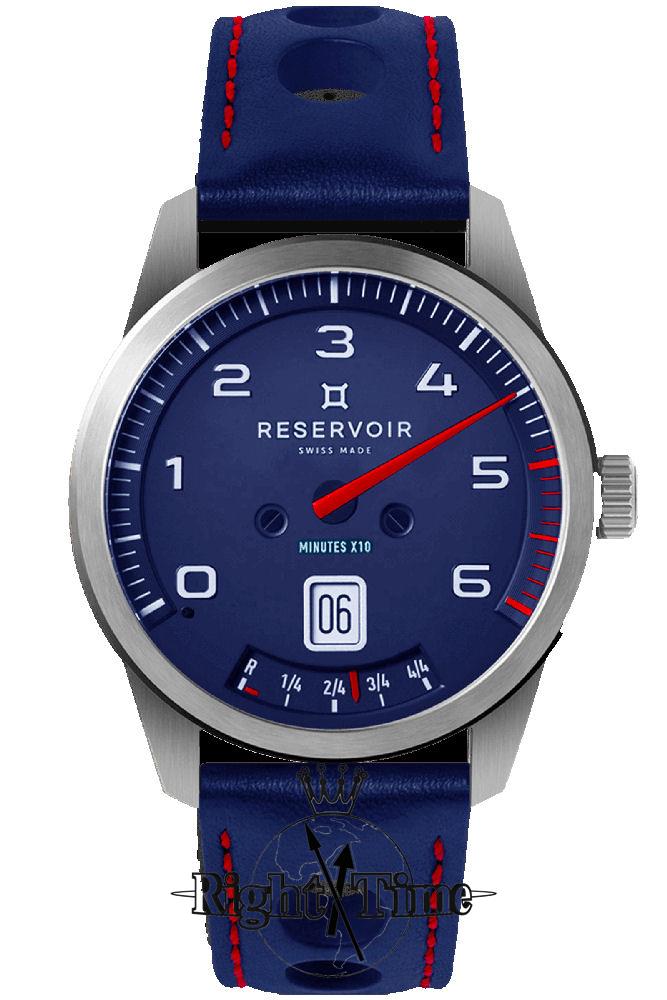 Reservoir GT Tour model RSV01.GT/130-32. "Classic" car race design with blue dial and red minute hand. Comes in satin finished stainless steel case on blue leather band and a spare Nato strap. Watch features: retrograde minute hand; jumping hours; power reserve indicator.