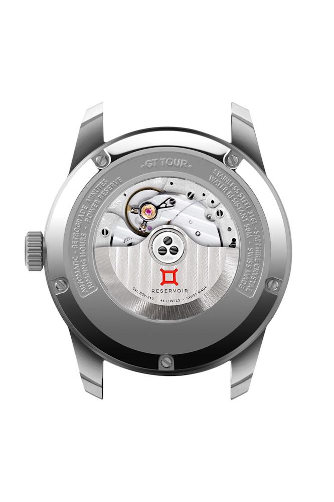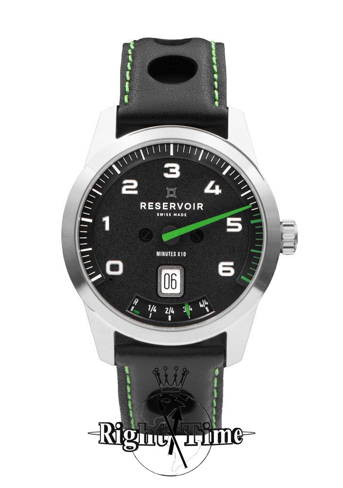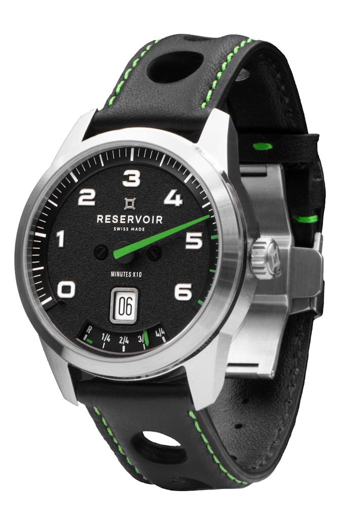 Reservoir GT Tour model RSV01.GT/130.SL. "Classic" car race design with black dial and green minute hand. Comes in stainless steel case on black leather band and a spare Nato strap. Powered by the new caliber RSV-240. Watch features: retrograde minute hand; jumping hours; power reserve indicator.