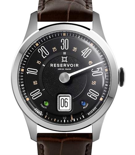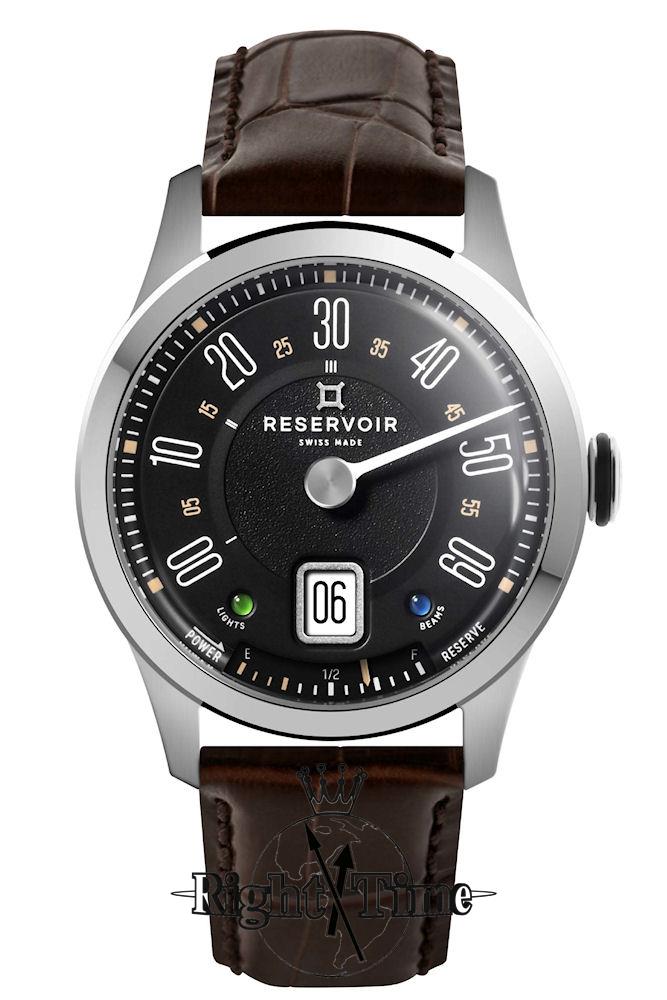 Reservoir Longbridge Club model RSV01.LB/130-12S. Black color dial. Stainless steel case with brown leather strap. Watch features: retrograde minute hand; jumping hours; power reserve indicator.