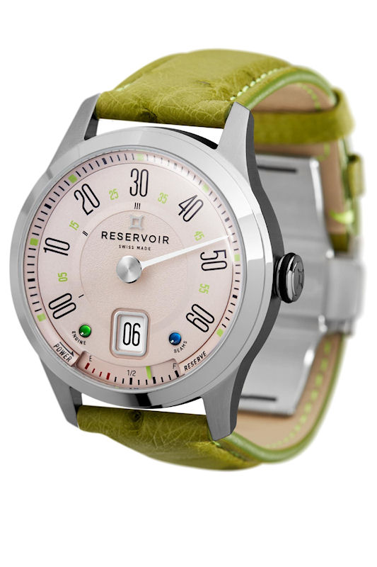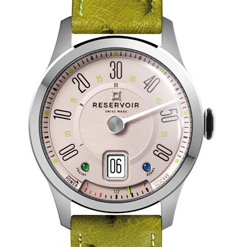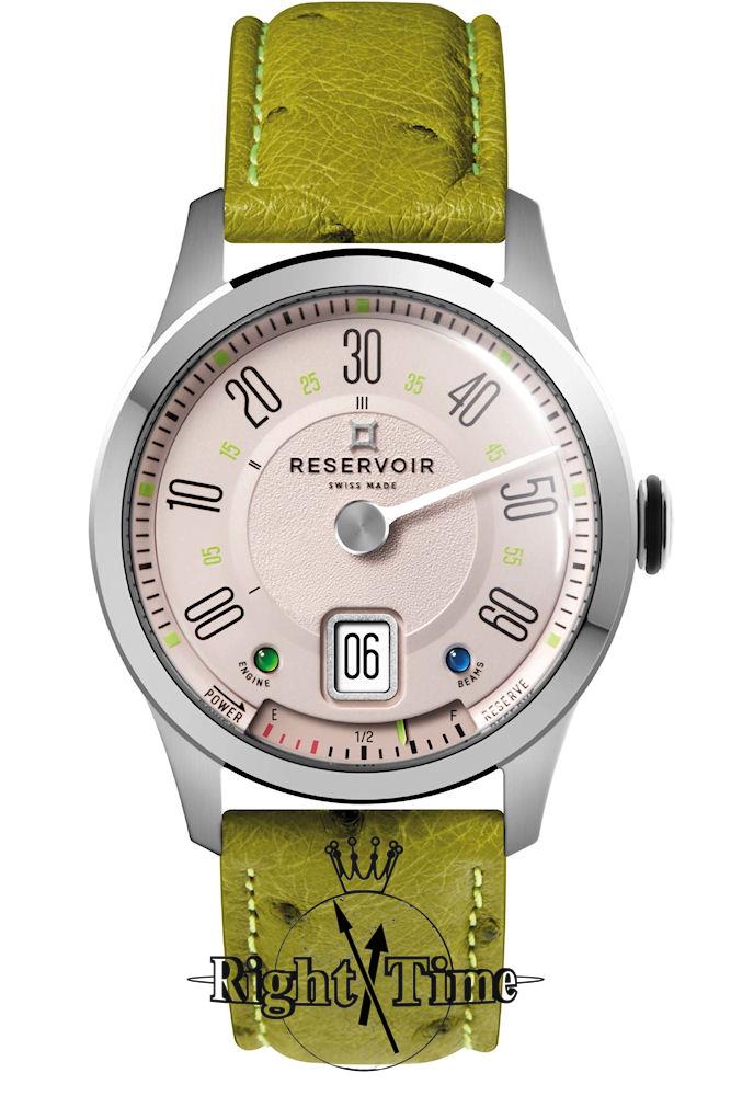 Reservoir Lady Longbridge model RSV01.LB/130-21S. Cream color dial. Stainless steel case with green leather strap. Watch features: retrograde minute hand; jumping hours; power reserve indicator.