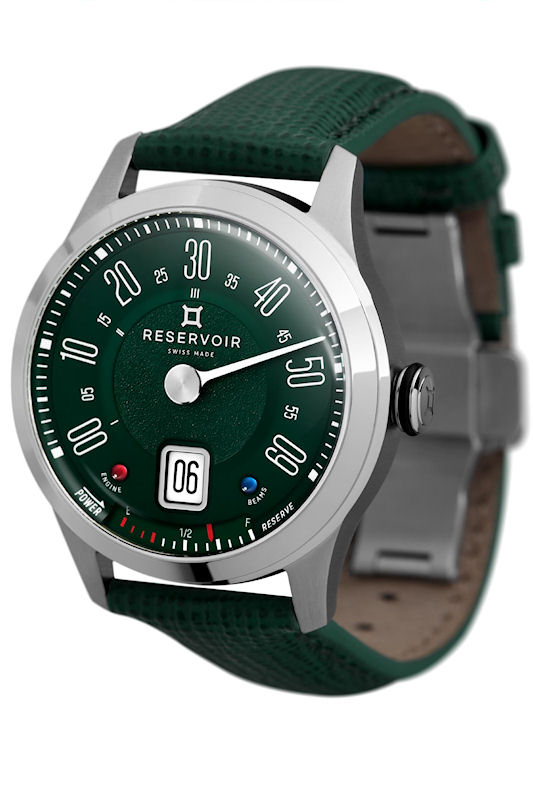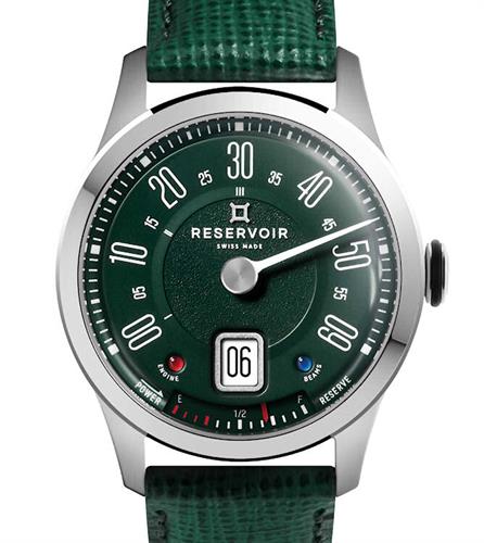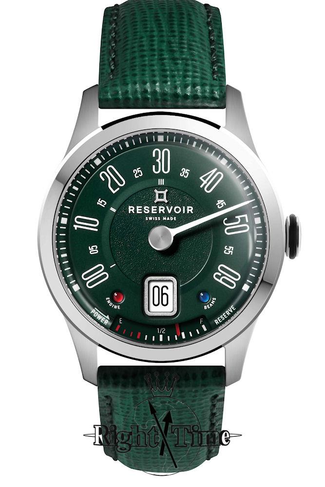 Reservoir Longbridge British Racing model RSV01.LB/130-62S. Green color dial. Stainless steel case with green leather strap. Watch features: retrograde minute hand; jumping hours; power reserve indicator.