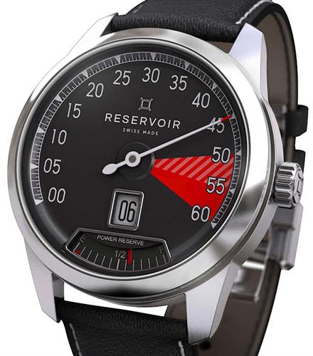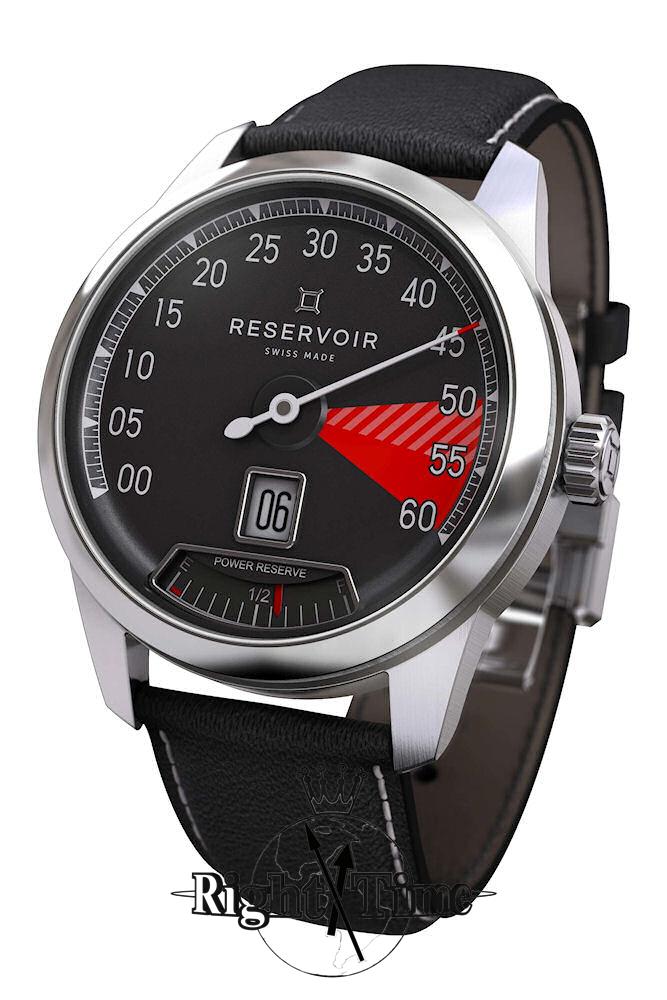 Reservoir Supercharged Sport Red Zone model RSV01.SC/130-12RZ5. Black dial with red color sector. Comes in stainless steel case with black leather strap and white stitches. Watch features: retrograde minute hand; jumping hours; power reserve indicator.