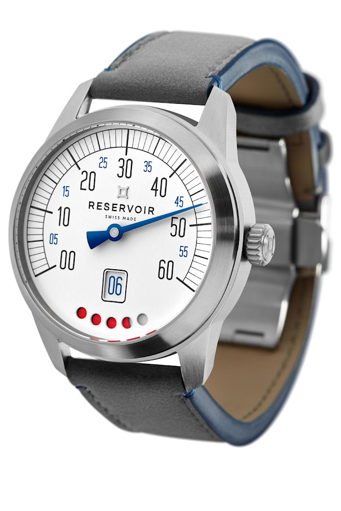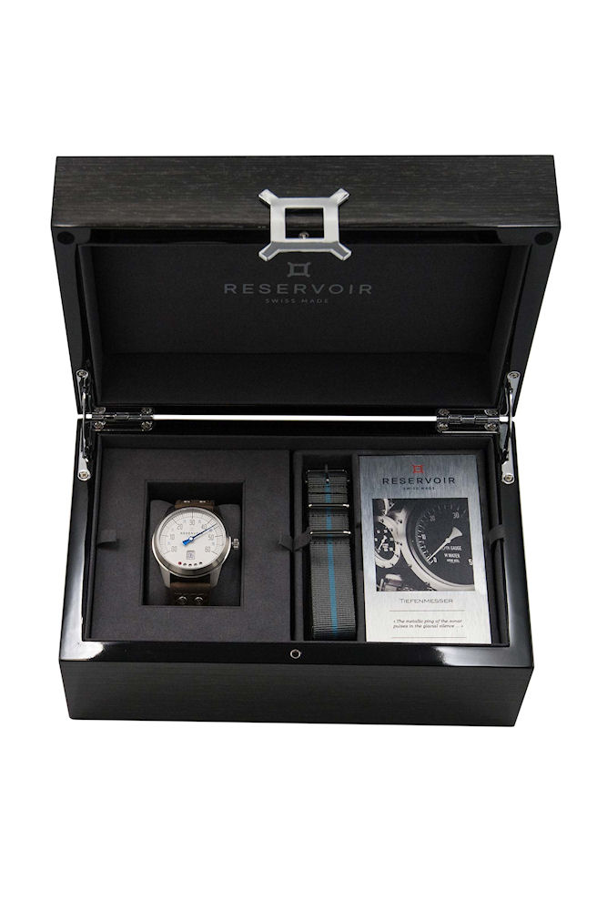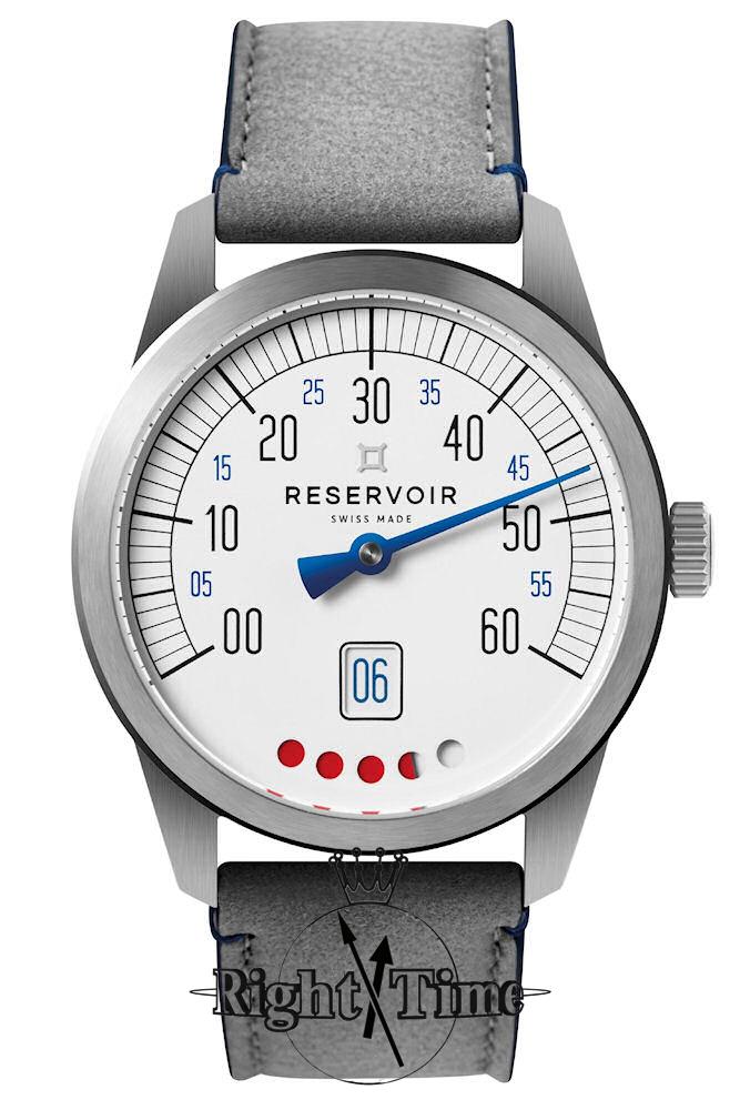 Reservoir Tiefenmesser model RSV03.TF/130-23. Inspired by submarine equipment. White dial with blue hand and markers. Stainless steel case with grey leather strap. Watch features: retrograde minute hand; jumping hours; power reserve indicator.