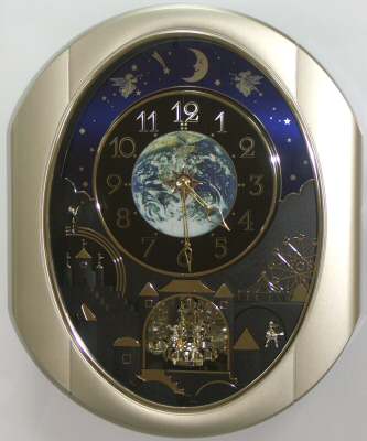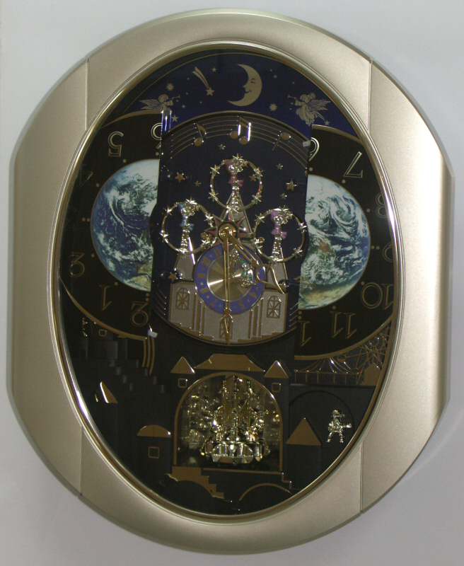 The face splits into two parts every hour. The parts slide away from each other and rotate while the clock plays one of six different melodies by Dynamic Wave Sound.