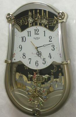 On the hour, the clock plays one of six different melodies by Clarion Tone System(CTS), while small musicians rotate and the trumpet and saxophone pendulums swing back and forth.