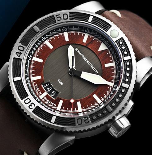 Schaumburg Watch AQM 4 - Wood. Stainless steel case. 0-60 bezel with Ceramic-Superluminova (ceranova) dot. Powered by automatic movement. Wood dial with date, luminous and markers. Water resistant to 500 meters. Comes with watch winder