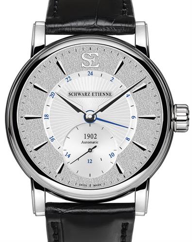 Schwarz Etienne Roma Manufacture Collection. Watch model WRO17MA24SS01AA powered by in-house made ASE 120.00 automatic movement with micro rotor. Grey and silver color textured dial with index markers, 24-hours second time zone indicator, and small seconds sub-dial at 6 o`clock. Steel case with black alligator leather band