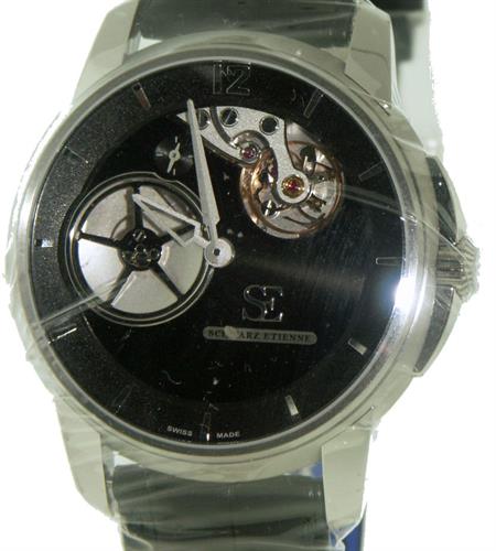 Schwarz Etienne Roswell Collection. Watch model WRW20TJ01SS01AA powered by in-house made automatic "Irreversible" ISE 100.00 movement with decentered micro rotor. Black partially skeletonized dial with small seconds sub-dial at 11 o`clock. Steel case with black alligator leather band