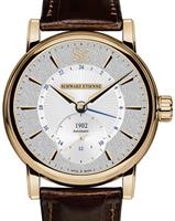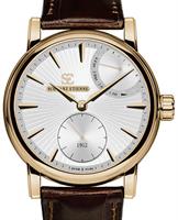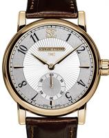 Schwarz Etienne Roma Manufacture Collection. Watch model WRO16MS27RB21AA powered by in-house made MSE 111.00 manual-wind movement with double barrels. Silver color textured dial with index markers, 4-days power reserve indicator at 2 o`clock, and small seconds sub-dial at 6 o`clock. 18ct solid rose gold case with brown alligator leather band