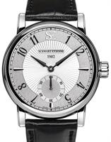 Schwarz Etienne Roma Manufacture Collection. Watch model WRO15MS24SS01AA powered by in-house made MSE 100.00 Manual Wind movement with double barrels. Contrasting grey and silver textured dial with Arabic numerals and small seconds sub-dial at 6 o`clock.