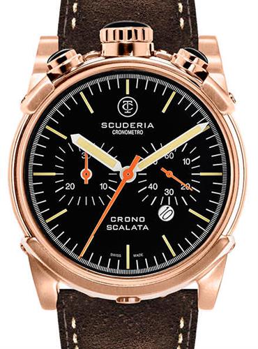 CT Scuderia Cronografo Collection model CS10150. Rose gold IP plated stainless steel case with brown leather strap. Powered by quartz chronograph movement. Black dial with lumi yellow markers. Water resistant to 100 meters