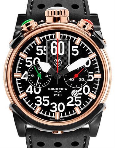 CT Scuderia Saturno Collection model CS40106. Stainless steel black IP and rose gold plated case with black perforated leather strap. Powered by quartz chronograph movement. Black dial with Arabic numerals. Green and red accents on the case and dial. Water resistant to 100 meters