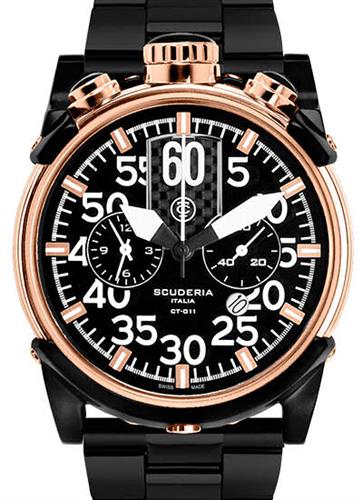 CT Scuderia Touring Collection model CS40107. Rose gold IP plated stainless steel case with black dial and black IP plated bracelet. Large Arabic numerals. Powered by quartz chronograph movement. Water resistant to 100 meters
