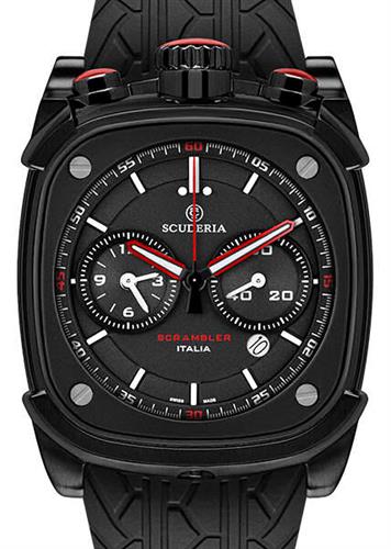 CT Scuderia Scrambler Collection model CS70110N. Black IP plated stainless steel case. Powered by quartz chronograph movement. Black dial. Red color accents on the case and dial. Black "Tire Track" silicon band. Water resistant to 100 meters