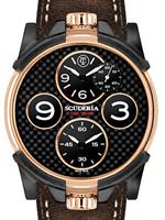 CT Scuderia 2 Tempi Collection model CS40303N. Black IP plated and rose gold plated stainless steel case. Powered by quartz movement. Black textured dial with 2 separate time zone sub-dials operated by 2 different crowns at 12 and 6 o`clock. Brown leather strap. Water resistant to 100 meters
