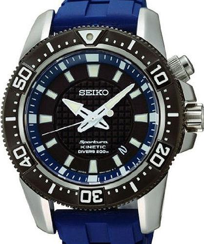 Seiko Sportura Kinetic Dive model SKA563. Quartz watch powered by your wrist movement. Stainless steel case. Sapphire crystal. Black/blue dial. Blue rubber band