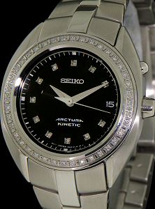 Ladies Seiko Arctura Kinetic watch model SKA895. Polished and satin finished case with diamonds on the bezel, sapphire crystal and observation back. Black dial with diamond markers. Stainless steel bracelet with tri-fold clasp.