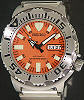 Seiko "Orange Monster" SKX781 diver wrist watch from Seiko Dive Watches Collection. 200m Water Resistant. SEIKO 7S26 Japanese Automatic movement with Day/Date calendar. Stainless steel case with uni-directional rotating 0-60 bezel and screw-down crown. Orange color dial with luminous hands and markers. Polished and satin finished stainless steel watch bracelet.