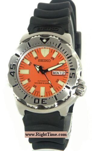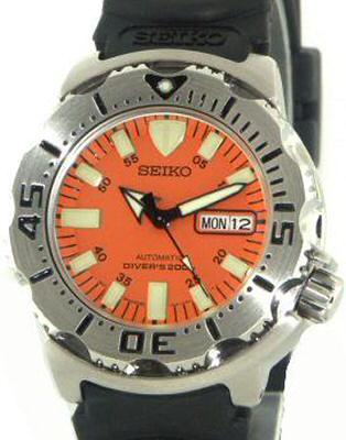 Seiko "Orange Monster" SKXA45 diver wrist watch from Seiko Dive Watches Collection. 200m Water Resistant. SEIKO 7S26 Japanese Automatic movement with Day/Date calendar. Stainless steel case with uni-directional rotating 0-60 bezel and screw-down crown. Orange color dial with luminous hands and markers. Pressure vented rubber (urethane) watch band.