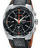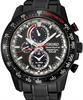 SEIKO Japanese Quartz Cal.7T62 movement with Alarm, Second Time Zone and chronograph functions. Black color bezel with Tachymeter scale, stainless steel case, black color leather watch band with red stitching.