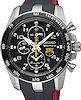 Seiko model SNAE93 Sportura Alarm chronograph watch. Quartz movement. Stainless steel case. Black dial with date, and alarm which can be used as second-time-zone indicator. Black and red rubber band.